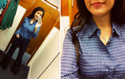 The striped blouse was an instant love. I love the color and even though I don't wear much green, I loved the mix of the navy blue with it. I'm wearing a size 00 and fit is great shoulder wise and on the sides. The length is long enough to tuck in but looks great untucked too. (I have it slightly rolled under in the picture.) The heart print blouse is SO cute. I don't know why they don't have it online yet but I'm sure it will be up soon. I love this top but they only had a size 0 which looks okay in the pictures but in person there was a lot of room on the sides and arms so I didn't bring it home with me. If I see it in my size though, I'll totally be getting it.
