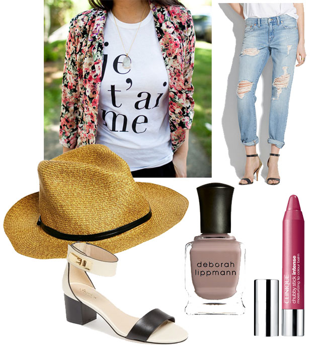 Just because you’re wearing boyfriend jeans doesn’t mean you can’t be trĂ©s chic! A cool tee and comfortable yet classy sandals work nicely with edgy greyish-nude nails and a berry lip.